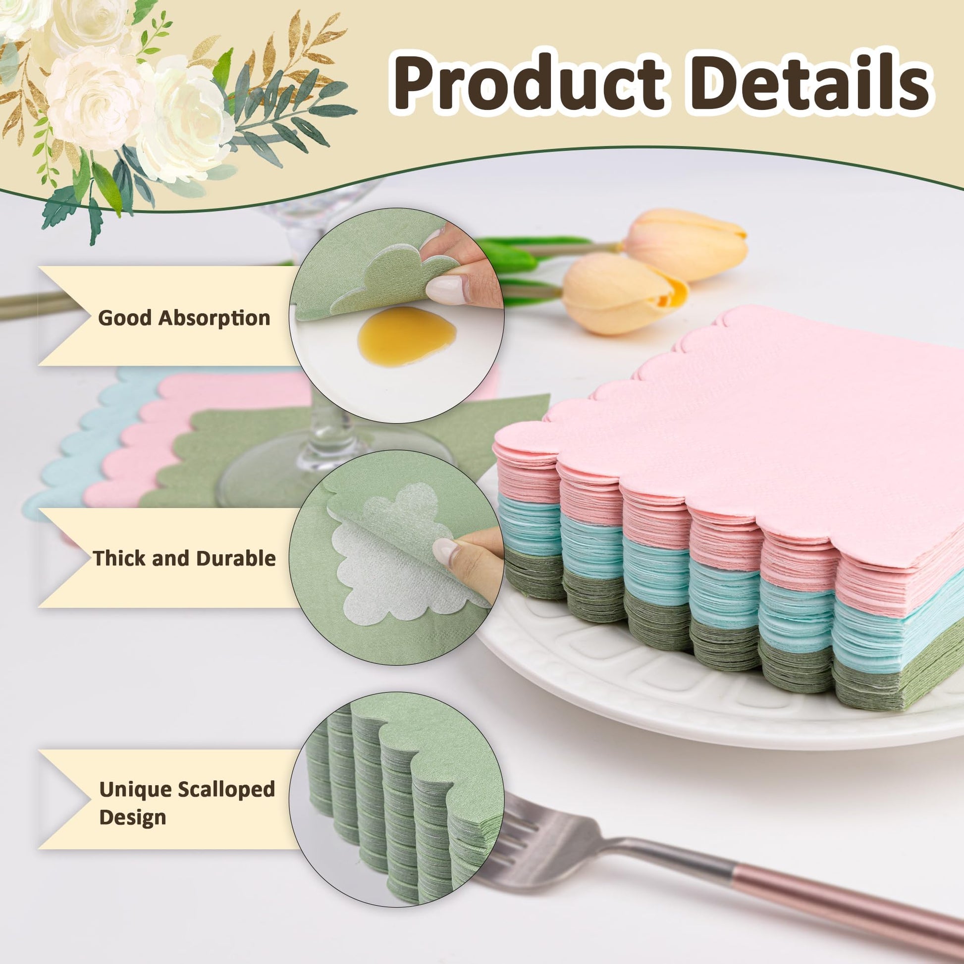 - Exquisite Design: The party napkins adopts unique scalloped edged design, bright colors also match perfectly with all kinds of parties, not only beautiful , but also add a touch of elegance to your party